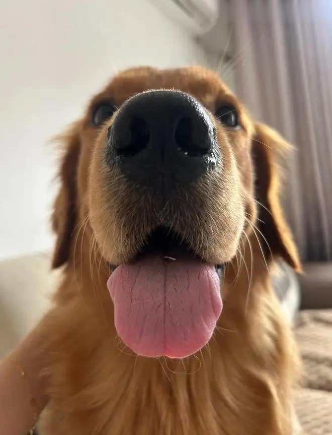 果然,那圆润明亮的眼眸闪烁着金毛犬特有的友善与聪慧,湿漉漉的鼻头透着活泼的生气,咧开的嘴巴仿佛挂着一个“计谋得逞”的憨笑,好像在说:“没想到吧?是我啦!”