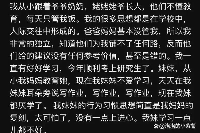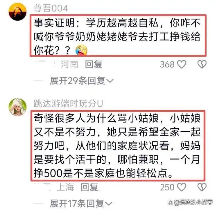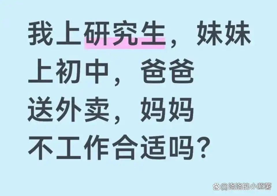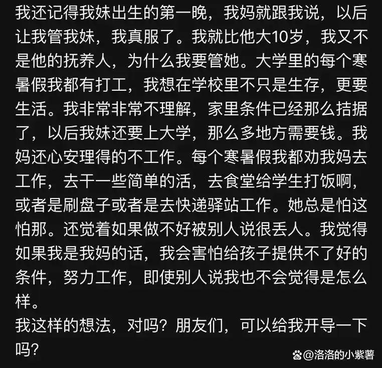 她自己学业繁重,还要兼职赚钱,妹妹以后上大学也需要钱,为什么母亲就不能出去工作分担一下呢?她建议母亲去食堂打饭或在快递驿站工作,这些工作都不难,在她看来,一个人如果不工作,那就是“非蠢即坏”,但这种话在很多家长听来,简直是大逆不道。
