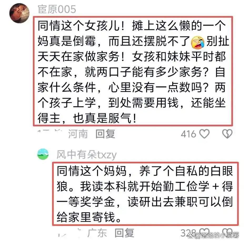 但也有人认为母亲有错,觉得她太懒,不要说在家做家务,女儿和妹妹平时都不在家,两口子能有多少家务?再说家庭条件,女儿好不容易考上研究生,母亲不仅不帮忙分担经济压力,还继续生孩子,这是父母素质低导致的悲剧,这个女儿一直在努力改变自己和家庭的处境,已经很不容易了,不应该被指责。
